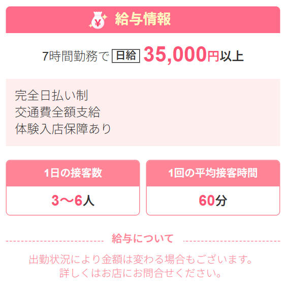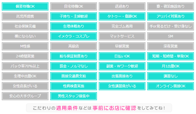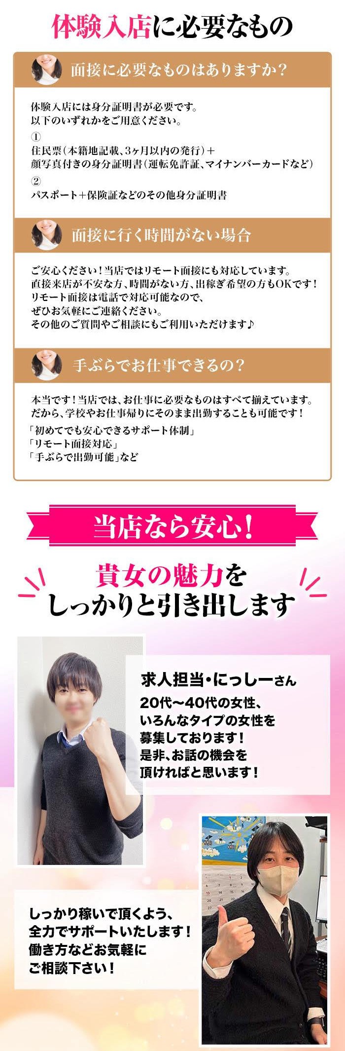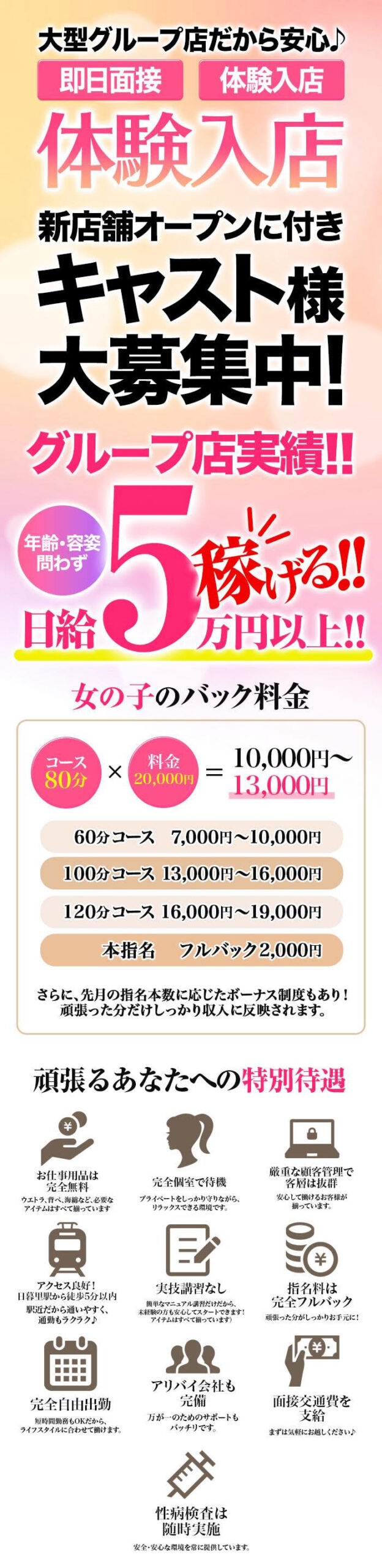 | 待遇 | 完全日払制 未経験者大歓迎 アリバイ会社完備 ノルマ一切なし 衛生管理万全 写真撮影無料 |