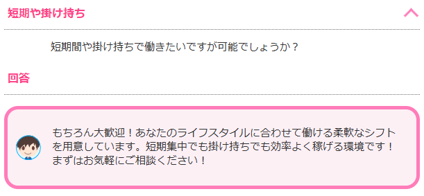 | 勤務日 | 週一からOK!自由出勤です♪ |