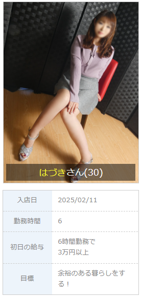 | 待遇 | 完全日払制 未経験者大歓迎 アリバイ会社完備 ノルマ一切なし 衛生管理万全 写真撮影無料 |
